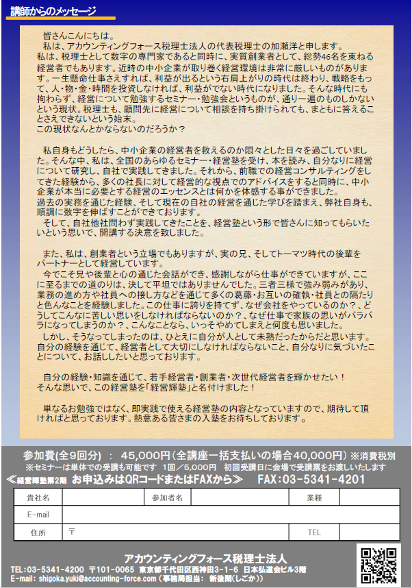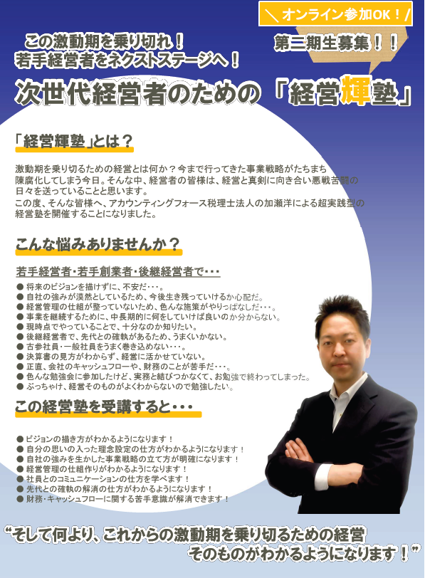 代表税理士 加瀬洋による、経営者のための「経営輝塾」第2期生を募集中です!