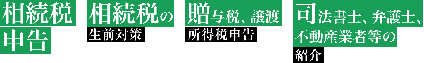 相続は税金以外にもやることが多岐にわたります。弁護士や司法書士、行政書士、不動産鑑定士、不動産屋、保険屋など相続に強い方をご紹介いたしますので、弊社にご依頼いただければワンストップで対応させていただきますので、ご安心ください。